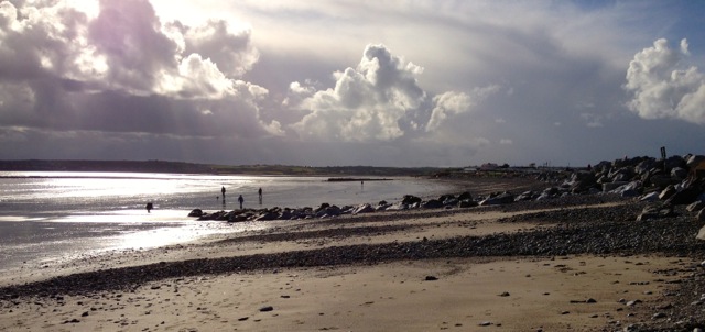 Sunlight reflects off the sea as ominous clouds approach from the west.