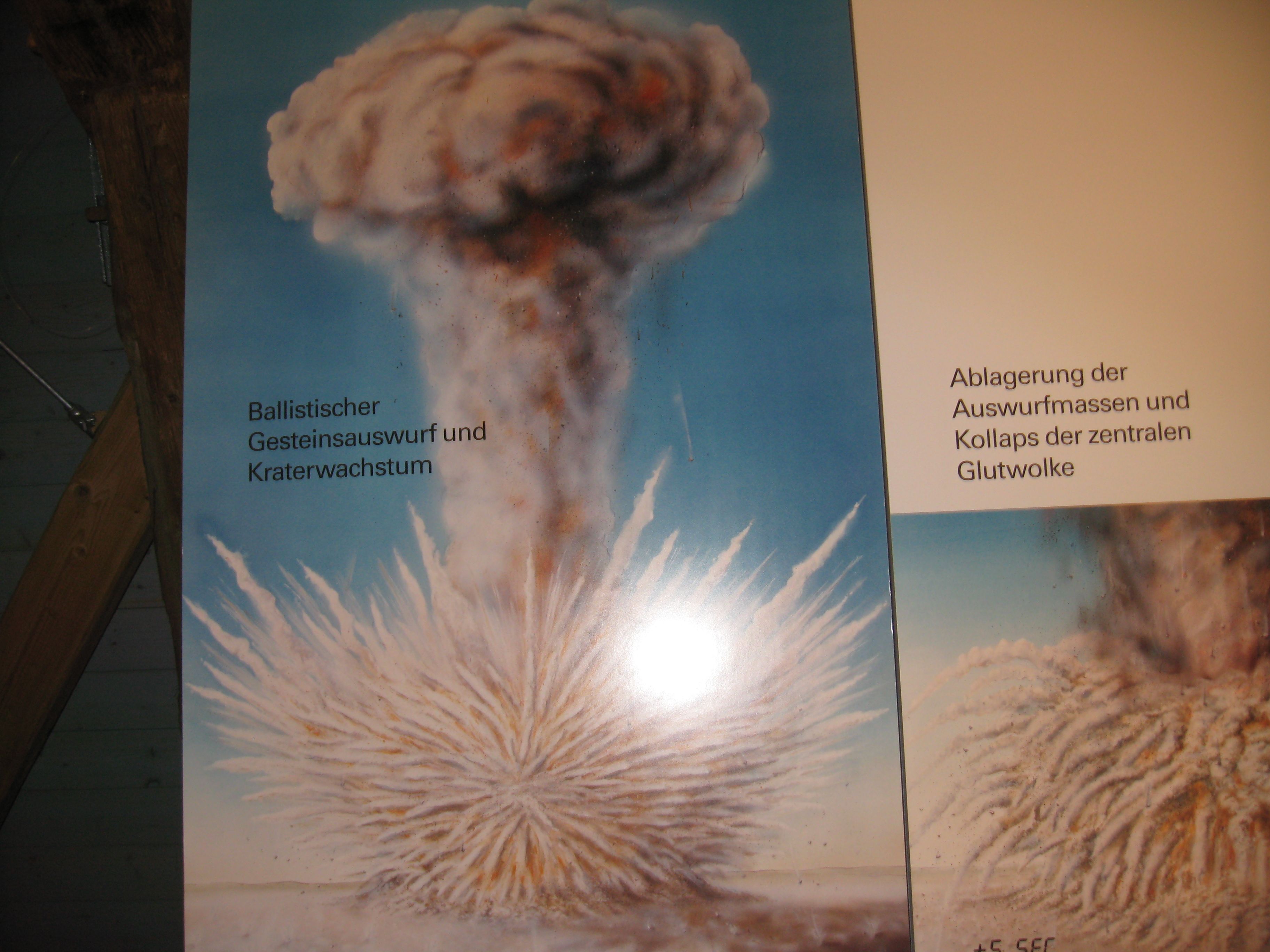 Here is what we know. 15 million years ago, two large objects, one measuring up to 1km in diameter, crashed into southern Germany. The large object hit Nordlingen. Hitting the ground at a speed of 45,000 km per hour, it punched a hole 4km deep into Earth’s crust, vaporising on impact. The surrounding rocks were compressed to a quarter of their size by the impact and they responded with an explosion measuring 18,000 megatonnes of TNT, hundreds of times larger than the greatest nuclear bomb ever detonated on this planet. An enormous shock wave killed all living things for a hundred kilometers in every direction with devastating effects felt much further afield. A mushroom cloud 30km high was generated. Much of this cloud, composed of melted rock from deep within the crust, subsequently fell back to earth, covering the crater and the region around the Ries with a material known today as Suevite. The church of St Georg in Nordlingen is built from this material.
