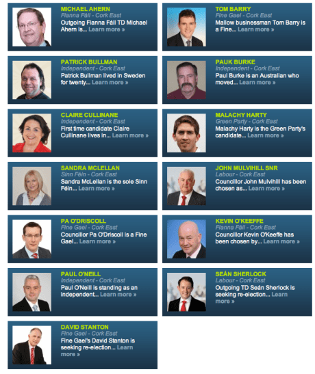 • Now we get to Labour. Sean Sherlock is engaging with people on Twitter but he has no video that I could find. His website is also, how do I put it, parochial. Here is a guy who could possibly find himself in the cabinet and yet he is campaigning on the subject of local roads and rezoning. Honestly, I’d prefer if these guys started thinking about Ireland and less about the parish pump. John Mulvihill has another parochial website, a Twitter stream (not engaging), and no video to give us an impression of what he is like. I am leaning towards Labour in this election but neither of the candidates inspire me with much confidence.